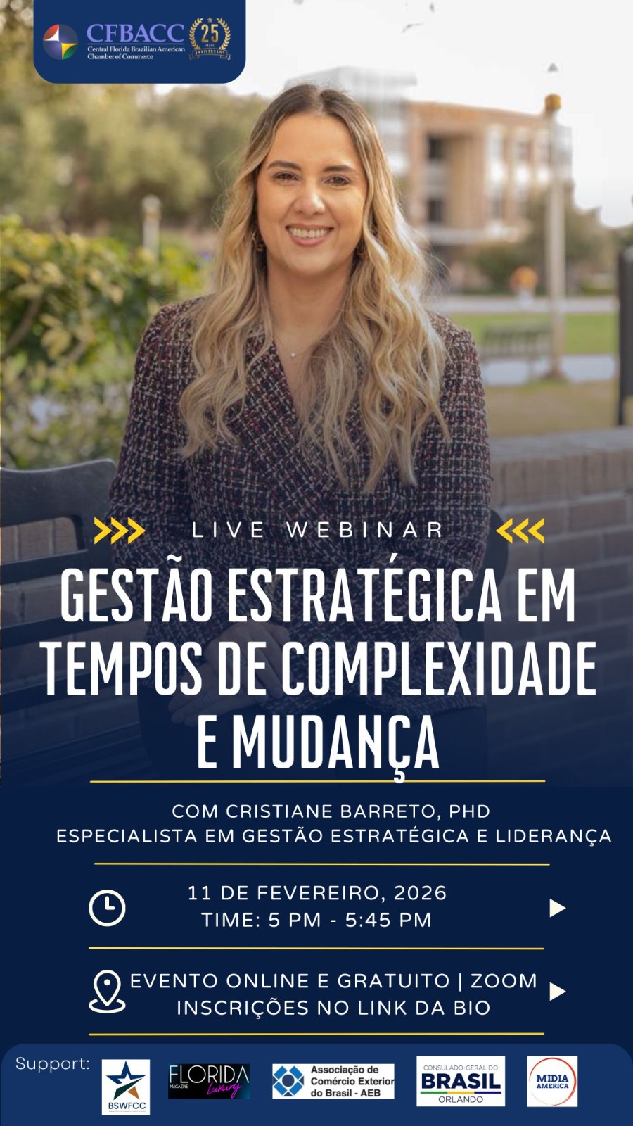 Em tempos de incerteza, líderes precisam de clareza, direção e estratégia. No dia 11 de fevereiro de 2026, a CFBACC convida você para um webinar AO VIVO, ONLINE, ABERTO AO PÚBLICO E 100% GRATUITO com Cristiane Barreto, PhD, especialista em Gestão Estratégica e Liderança. Durante o encontro, serão abordados temas essenciais para a liderança contemporânea, […]